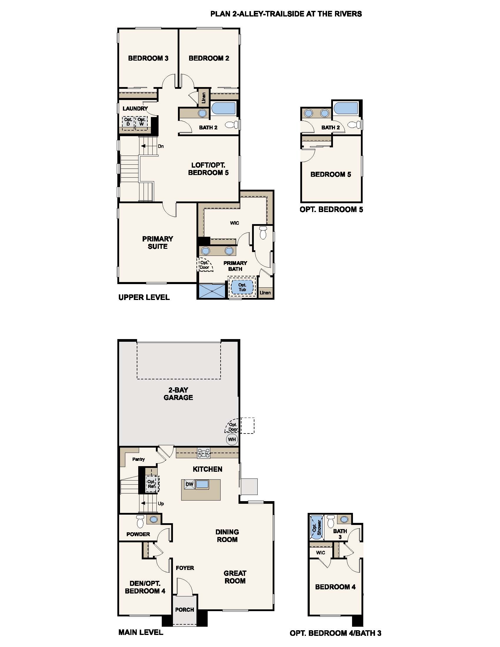 Plan 2 at Trailside at The Rivers features two stories of inspired space, designed to suit your daily living and entertaining needs. As you enter the home, you’ll find a generous secondary bedroom and a full bathroom—perfect for privacy and relaxation. The foyer leads to an impressive open-concept layout, anchored by a wide-open great room and a well-appointed kitchen—boasting a generous center island, spacious dining area, walk-in pantry and direct access to a charming courtyard. Upstairs, there are two secondary bedrooms, a full hall bathroom, a wide-open loft and a convenient laundry room. Completing the upper level is a stunning owner’s suite—showcasing a sizable walk-in closet and a deluxe bathroom with dual vanities, a tub and a walk-in shower.